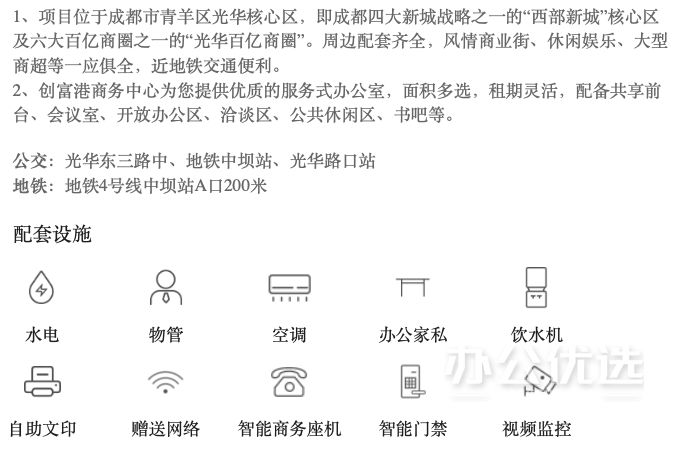 创富港成都光华中心共享办公空间提供1至8人独立办公室,以及10至12人带经理室套间。此外,还提供15人独立会议室,价格为80元/小时。参考价格为独立办公室700元/间起。